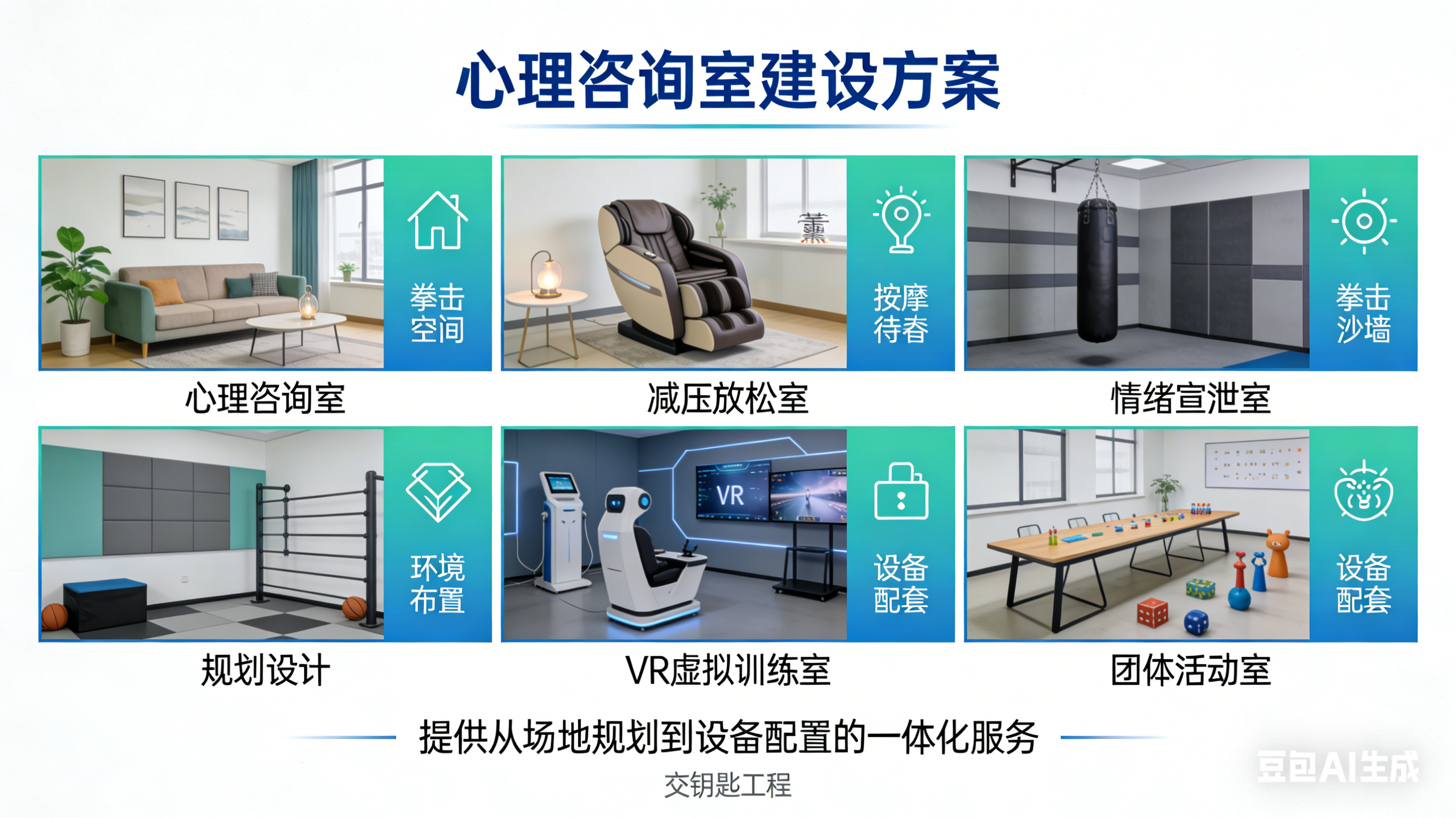 心理咨询室建设方案:承接各类心理功能空间的“交钥匙”工程,包括心理咨询室、减压放松室、情绪宣泄室、VR虚拟训练室、团体活动室等的规划设计、环境布置与设备配套,提供从场地规划到设备配置的一体化服务。